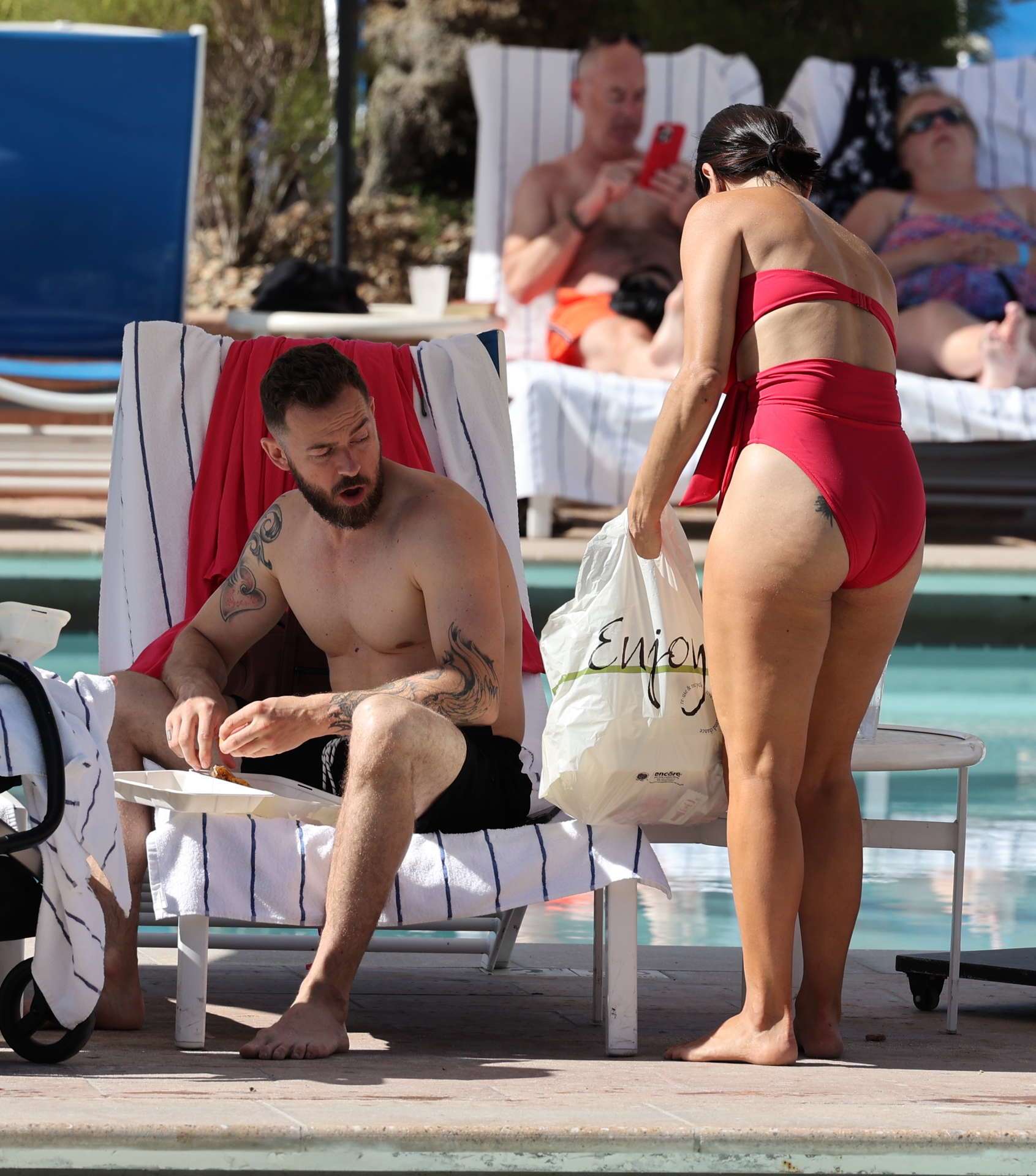 04/17/2022 EXCLUSIVE: NIkki Bella and Artem Chigvintsev soak up the sun in Indian Wells, California. The couple spent the Easter holiday with their one year old son, enjoying a bite by the pool and later a dip at the Renaissance Esmeralda Indian Wells resort.