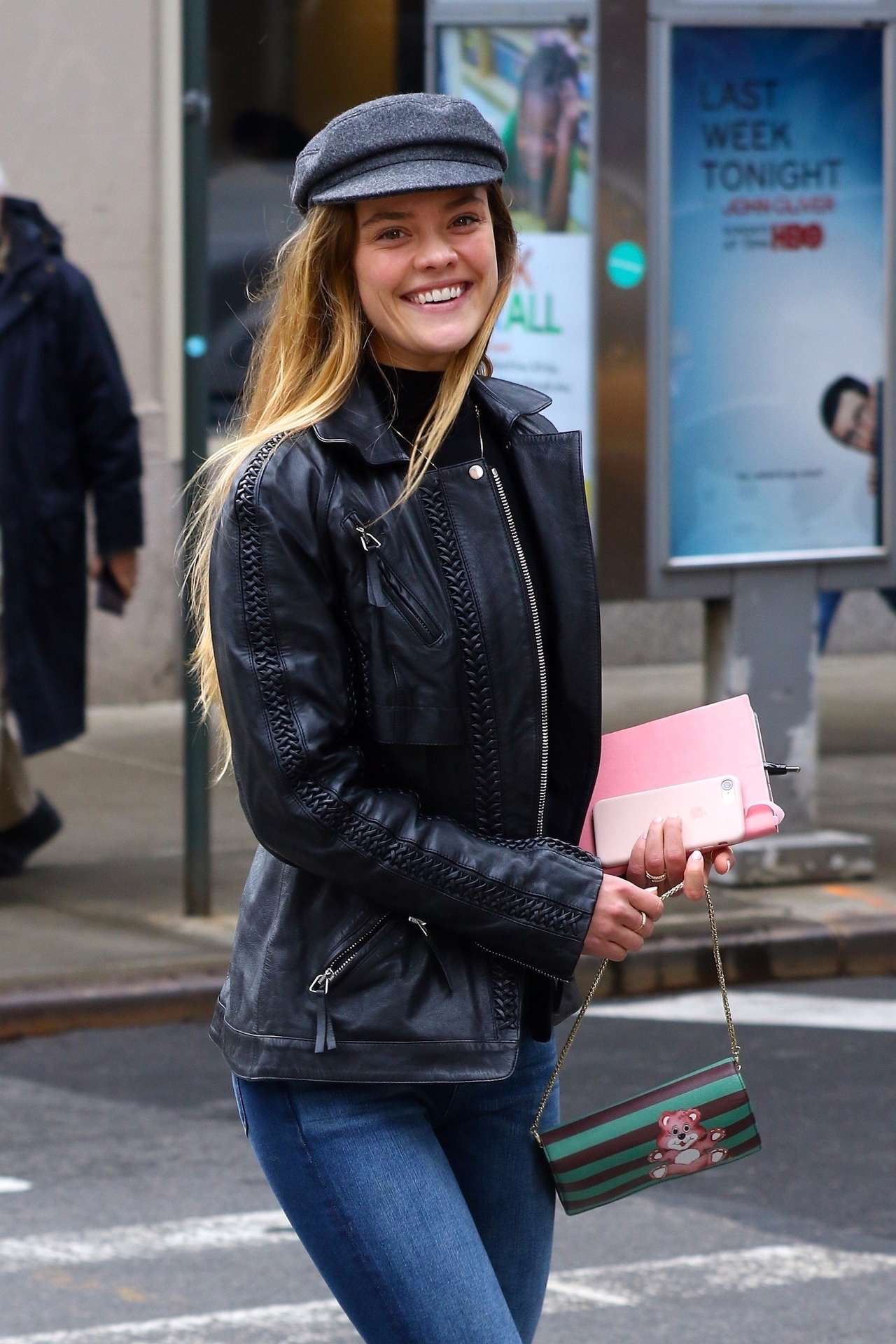New York, NY – Nina Agdal is a girl about town as she is spotted trekking through Midtown in super chic style. The Danish swimsuit model isall smiles as she marches up Park Ave. holding a colorful purse with a teddy bear, black trainers, blue denim jeans, a black T-shirt covered with an edgy black leather jacket. Nina accessorizes her look with a grey ascot cap.