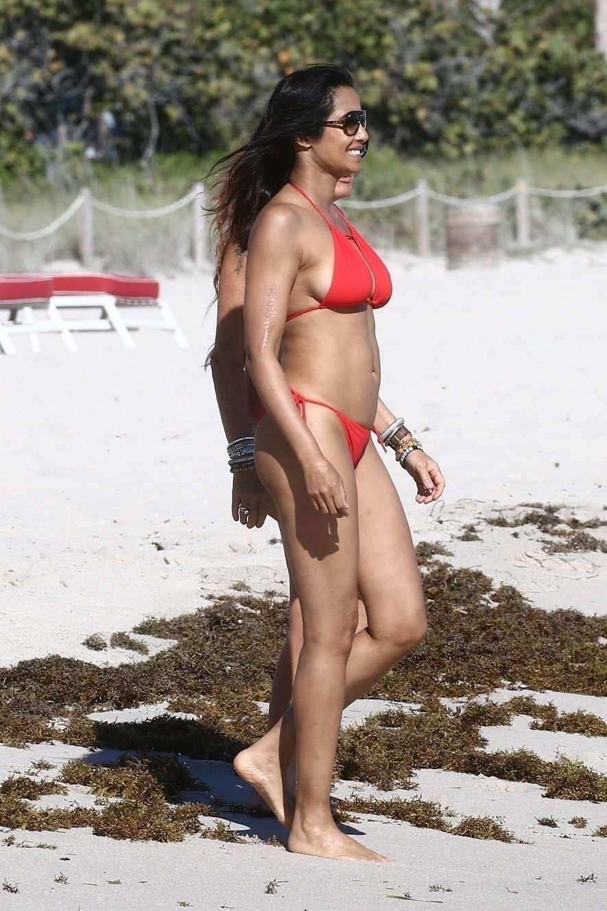 Padma Lakshmi in Red Bikini at Beach in Miami