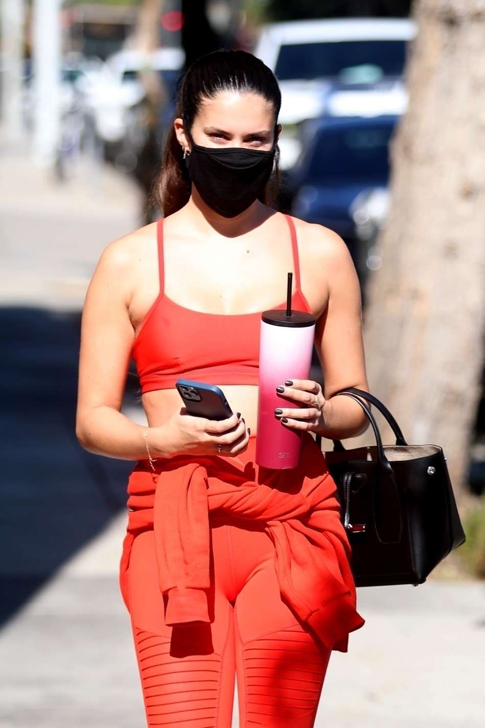 West Hollywood, CA – Sara Sampaio checks her messages on her phone after getting in her workout today at the DogPound gym.