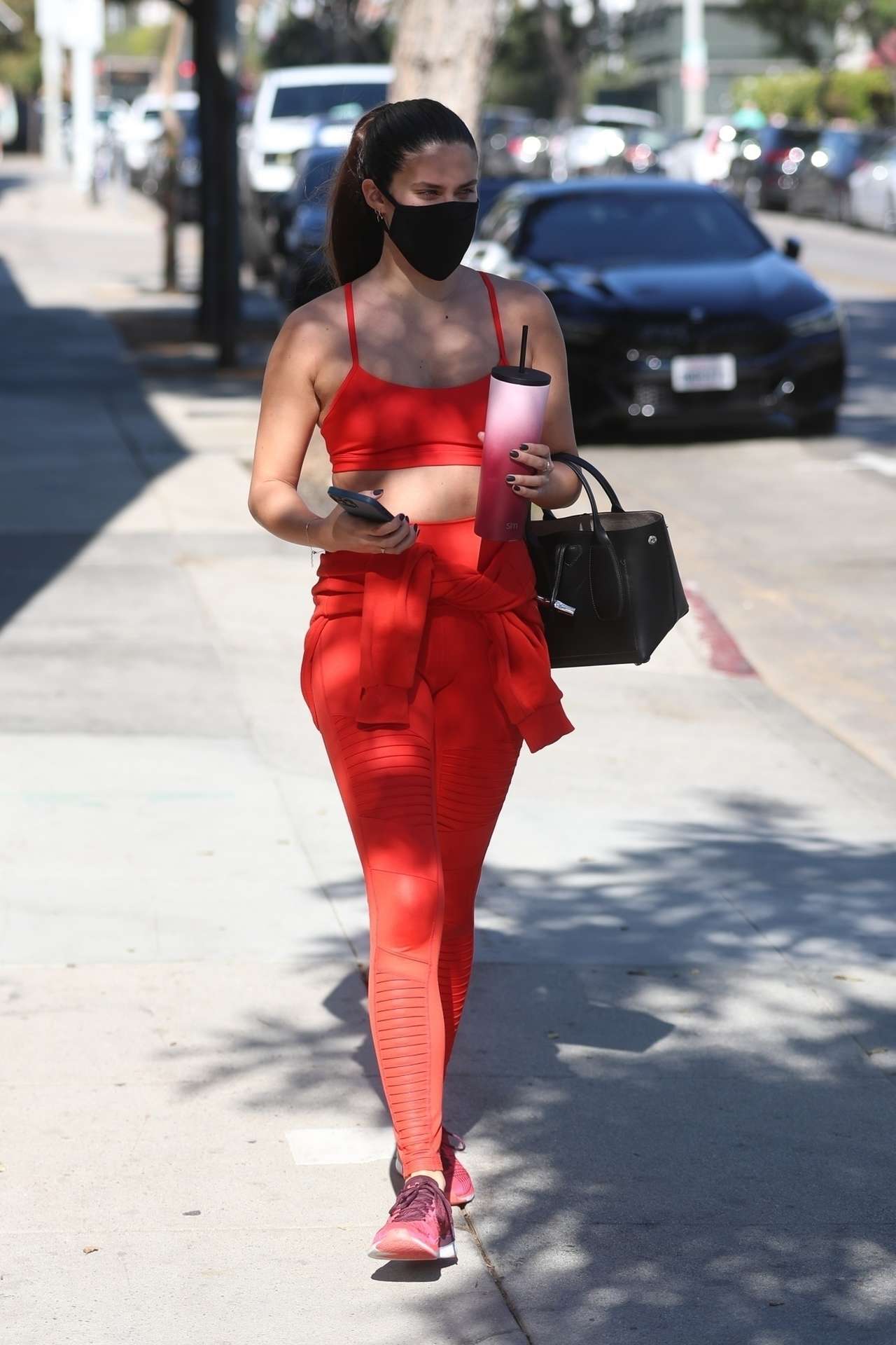 West Hollywood, CA – Sara Sampaio checks her messages on her phone after getting in her workout today at the DogPound gym.