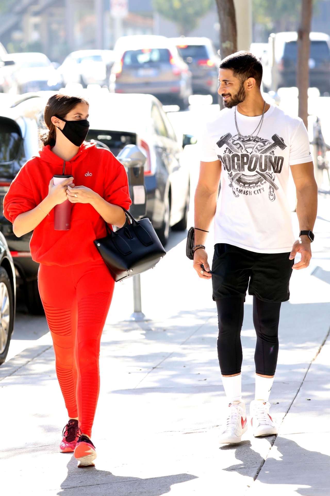 West Hollywood, CA – Portuguese model Sara Sampaio seen arriving at the DogPound gym this morning and gets a friendly escort by her trainer. Sara looked sporty in a all red ALO outfit.