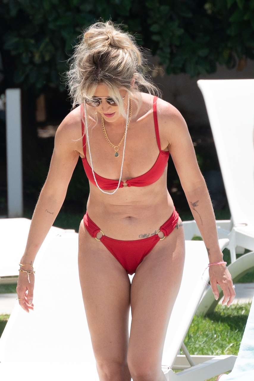 EXCLUSIVE: Sarah Jayne Dunn stuns in a red bikini poolside in Marbella, Spain. The former Hollyoaks actress, 40, has relaunched her career as a star of the sexy subscription site OnlyFans.