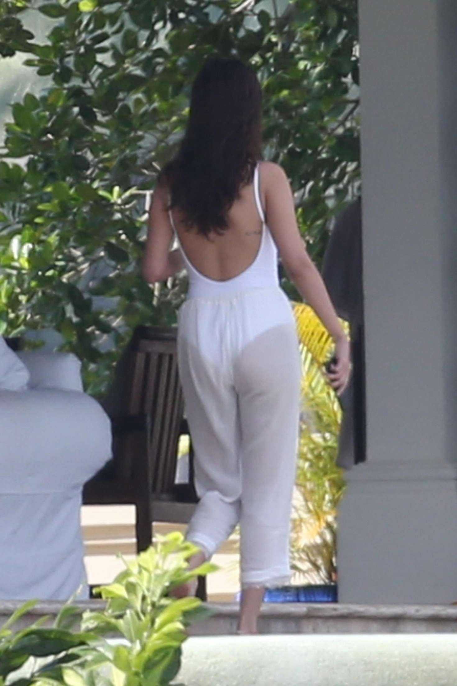 Selena Gomez in White Swimsuit and Pants at a pool and sailing in Montego Bay