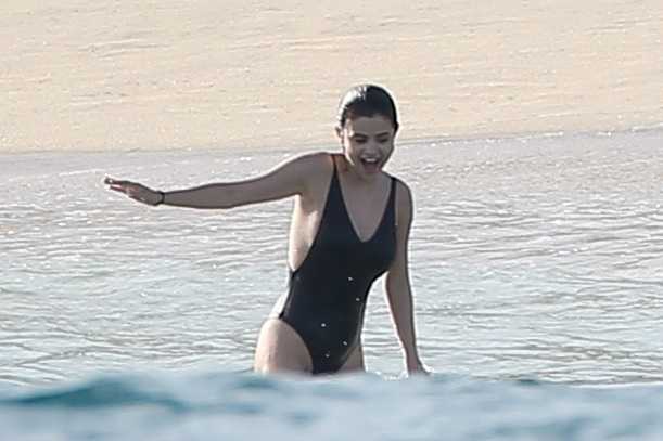 Selena Gomez in Black Swimsuit at the Beach in Cabo