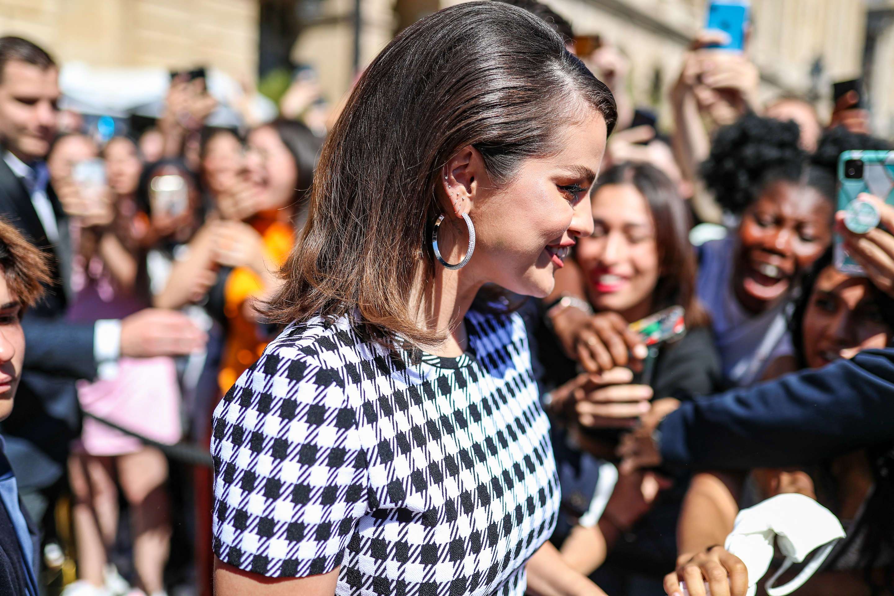 Exclusif – La chanteuse, actrice et productrice américaine Selena Gomez à la sortie de l’hôtel de Crillon à Paris, France, le 8 juillet 2022. Selena porte un ensemble avec un top crop et une à carreaux noir et blanc et des talons blanc. Exclusive – For Germany Call For Price – American singer, actress and producer Selena Gomez leaving the Hôtel de Crillon in Paris, France, on July 8, 2022. Selena is wearing an ensemble with a black and white checkered crop top and white heels.