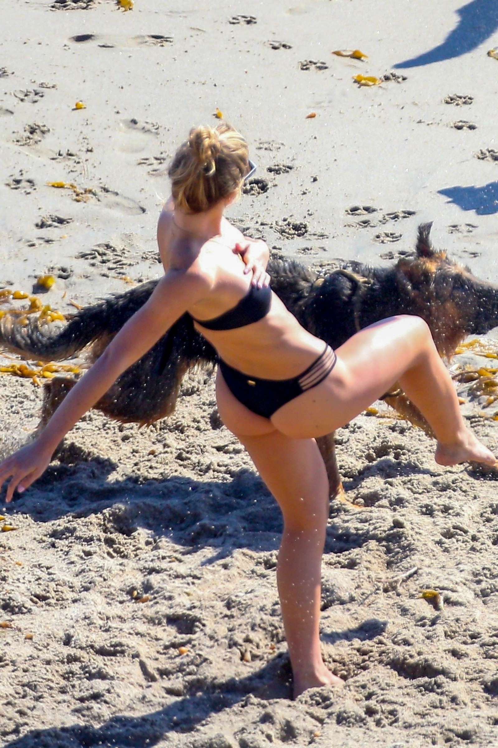 Attached to: Shauna Sexton in Black Bikini with Dogs on the Beach in Malibu