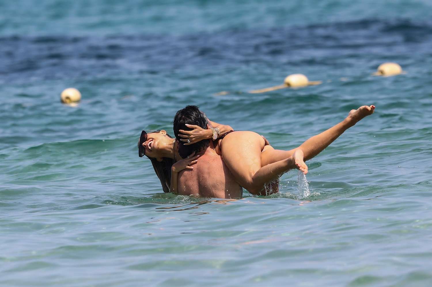 ** RIGHTS: ONLY UNITED STATES, AUSTRALIA, CANADA, NEW ZEALAND ** Saint-Tropez, FRANCE – Sylvie Meis kisses her husband Rafael van der Vaart during a refreshing swim at the Pampelonne beach.