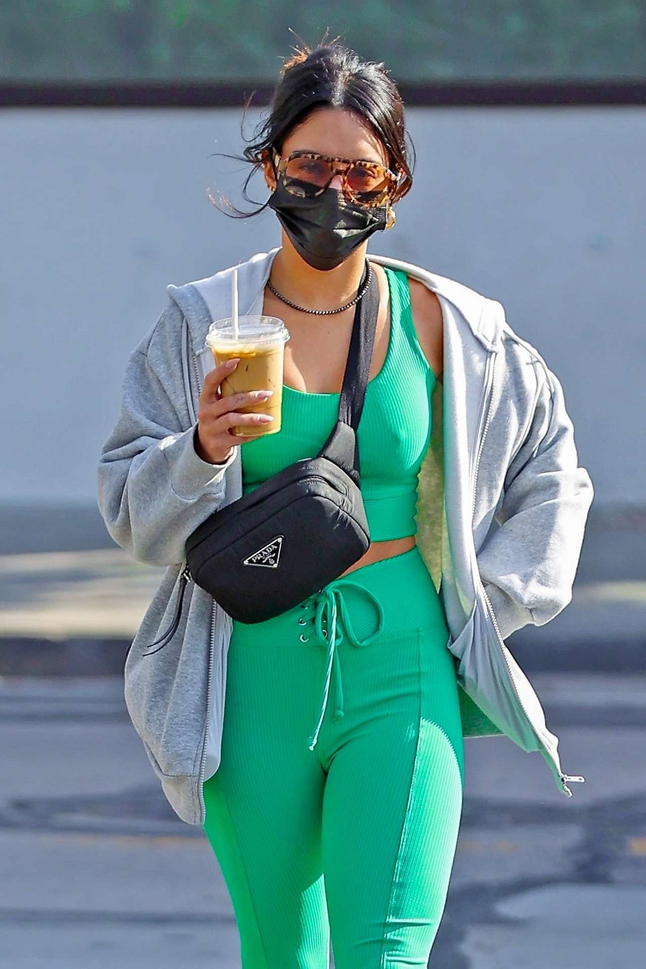 *EXCLUSIVE* West Hollywood, CA – Vanessa Hudgens enjoys her iced coppe after a trip to the Dogpound Gym in Weho.